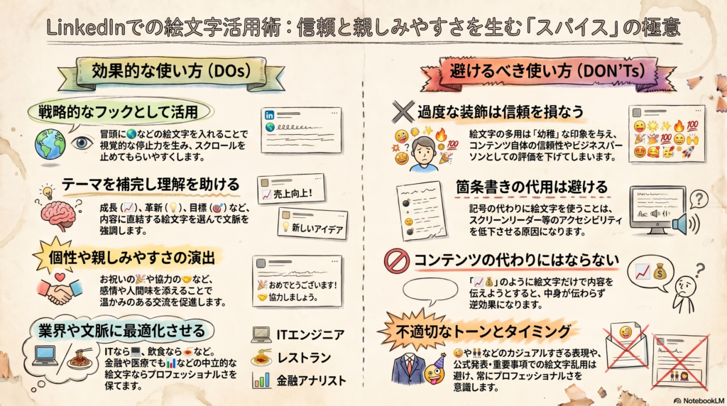 LinkedInでの絵文字は、文章を人間的に、読みやすくするためのスパイスです。適度に使えばアルゴリズムにも人間にも好まれますが、乱用すると逆効果になりかねません。