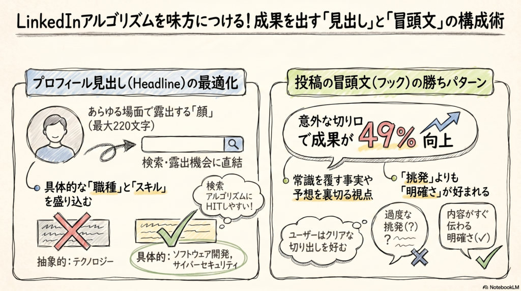 LinkedInのアルゴリズムは、どの投稿を誰に届けるかを決める際に、内容だけでなく見出しや冒頭文の構造も評価しています。