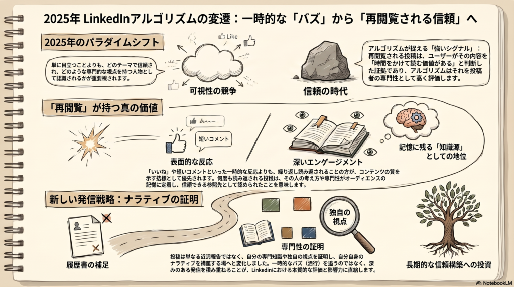 2025年のLinkedInは、可視性の競争から信頼とシグナルの時代へと移行しています。目立つことよりも、どのテーマで信頼され、どんな視点を持つ人物として認識されるかが重要です。再閲覧される投稿はこの信頼の証であり、アルゴリズムはそれをユーザーの専門性や影響力を示す強いシグナルとして扱います。