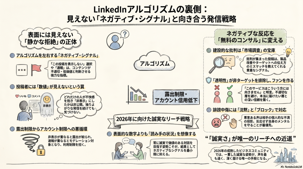 LinkedInにおける投稿の評価は、いいねやコメントといった目に見えるポジティブな反応だけで決まるわけではありません。実は、ユーザーが密かに行う非表示や通報といったネガティブな行動シグナルも、アルゴリズムの背後でコンテンツの命運を左右する極めて重要な要素となっています。