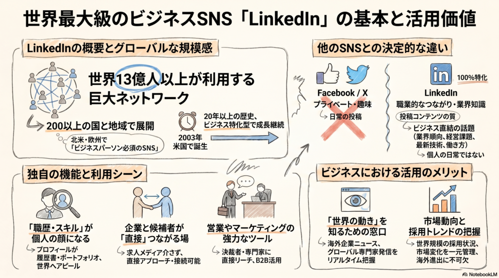 LinkedInは、世界で13億人以上が利用するビジネス特化型SNSです。2003年に米国で誕生し、現在は200以上の国と地域で展開されています。特に北米や欧州では「ビジネスパーソンなら必ず使うSNS」として認知されており、採用、人材ネットワーク、営業、情報収集など、多様な場面で欠かせない存在となっています。